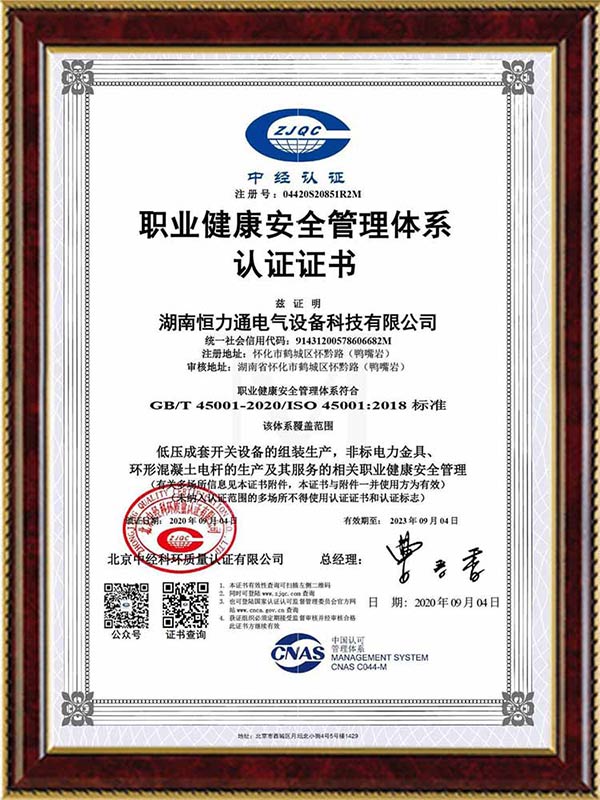 ISO45001職業健康安全管理體系認證證書